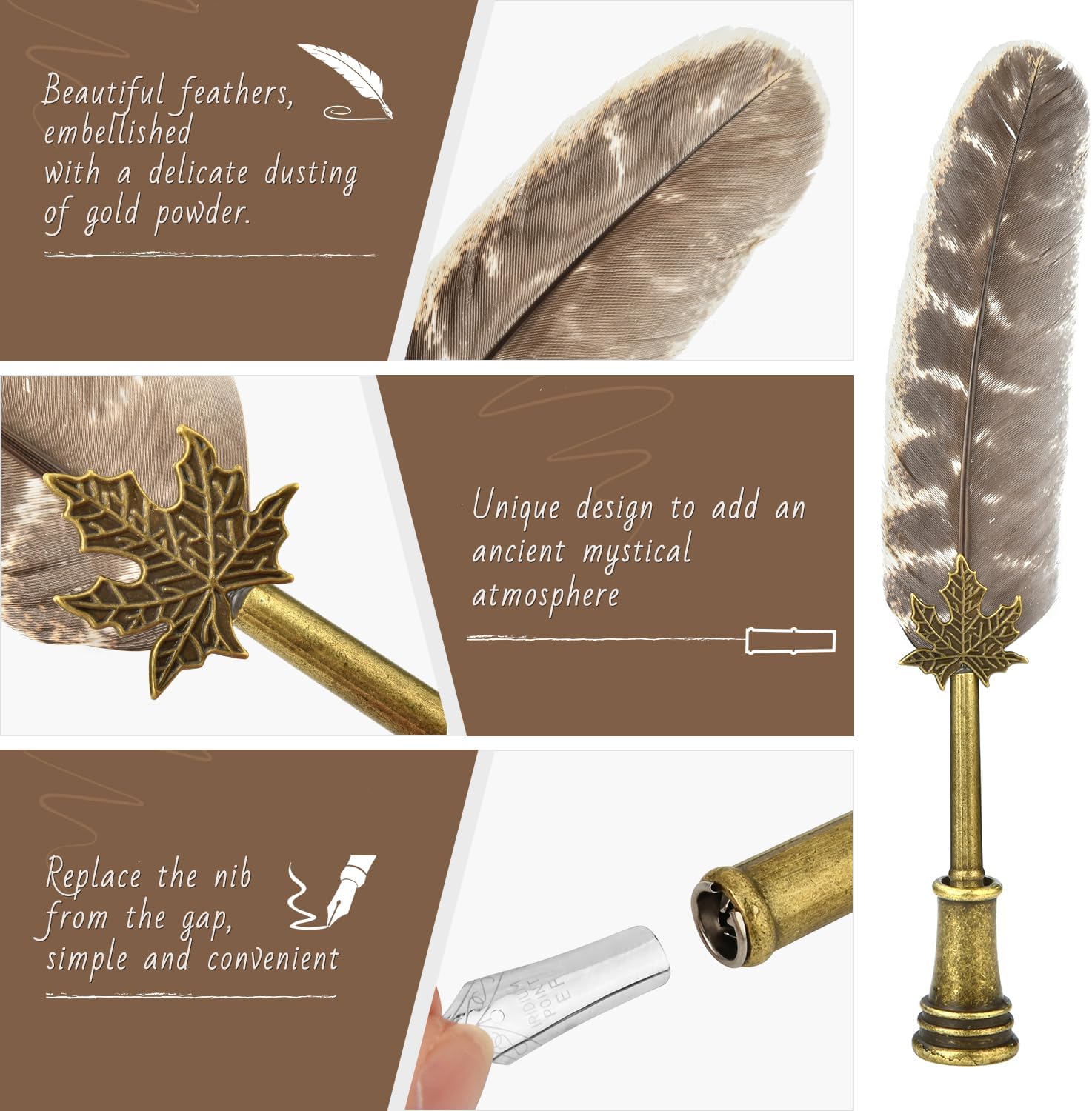 Hethrone Feather Pen and Ink Set - Calligraphy Quill Pen Set Includes Dip Pen, 5 Replacement Nibs and Pen Holder for Writing Lovers (Brown)